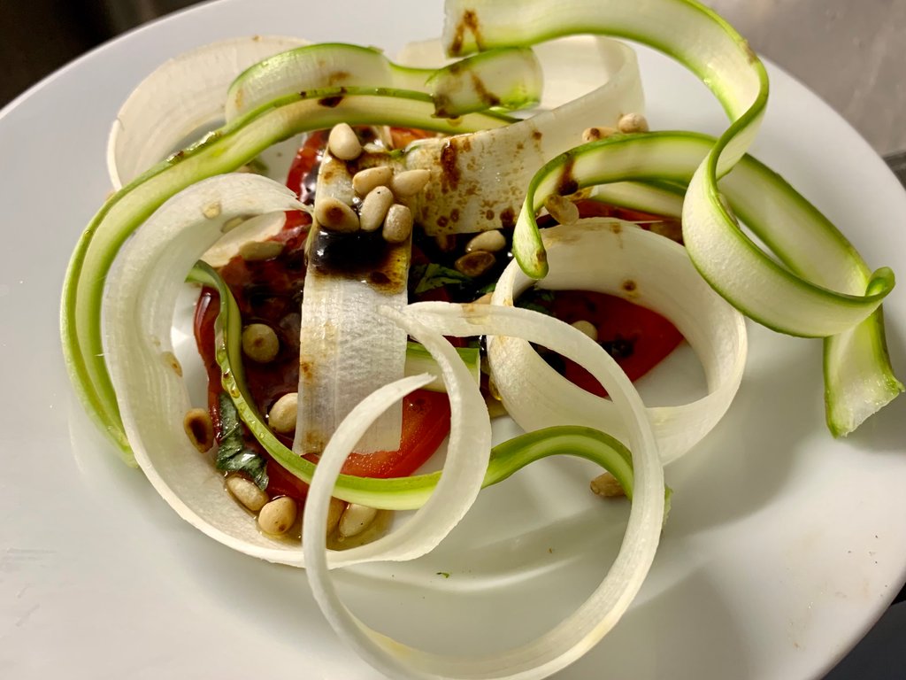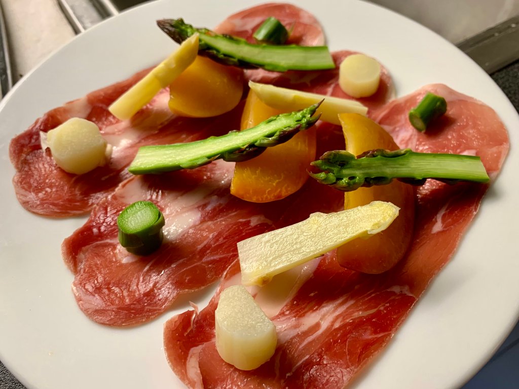 Dvojí carpaccio: chřestové a z hovězi svíčkové s piniemi a marinovanými rajčátky