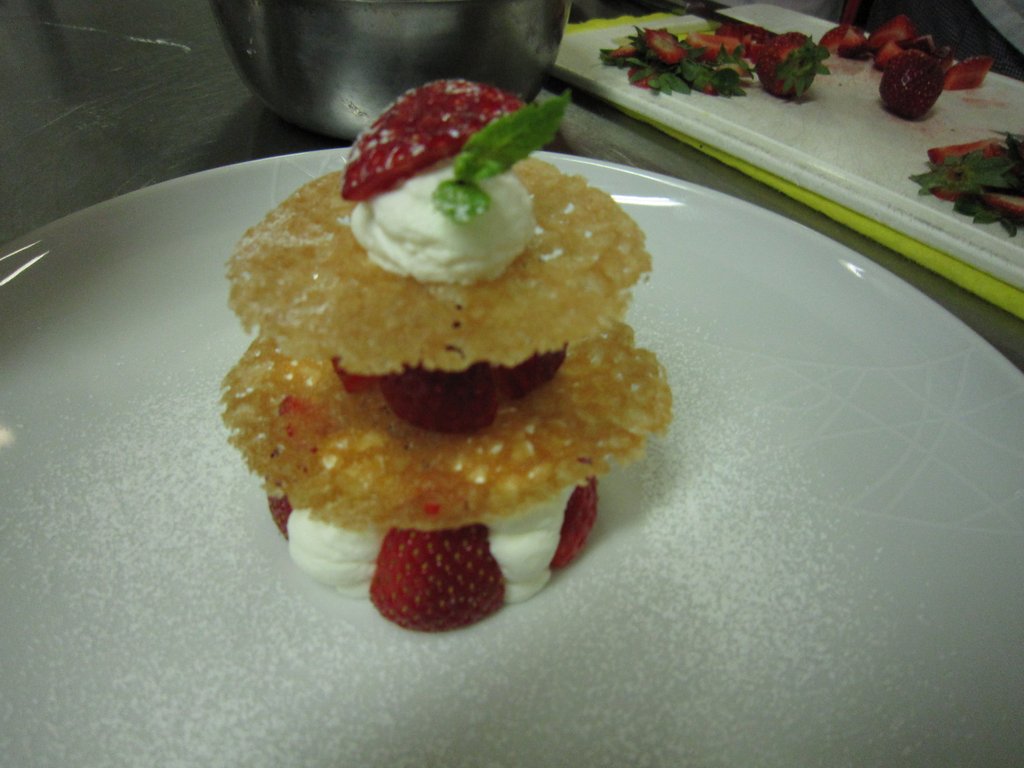 Na studený plech natřít tenkou vrstvu těsta a péct na 210 °C 7 – 8 minut. Vyšlehat smetanu do tuha, prokládat čerstvým ovocem a vrstvit dezert.