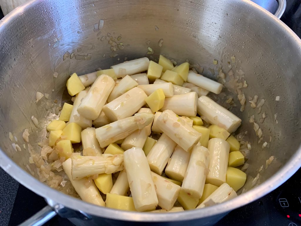 Na másle opéct šalotku, kousky chřestu, zastříknout octem, vínem, zalít vývarem a vařit do změknutí. Chceme-li polévku hustou, povaříme s bramborem. Přidat smetanu, rozmixovat a propasírovat. Před podáváním vyšlehat s kořením piment d'espelette.