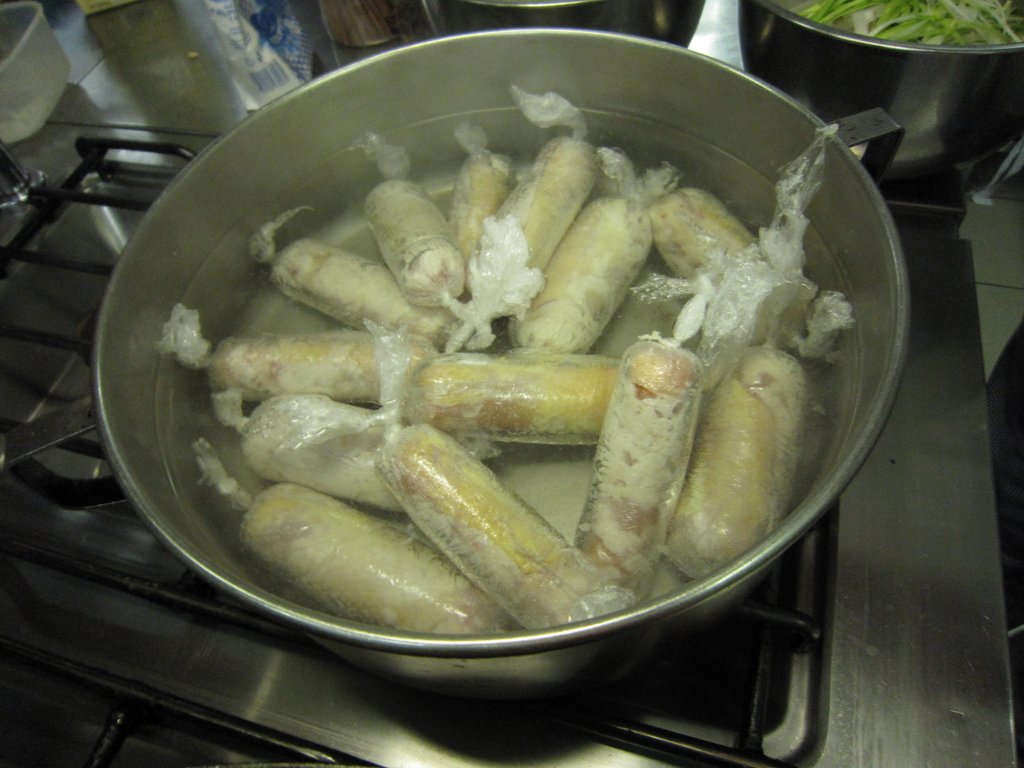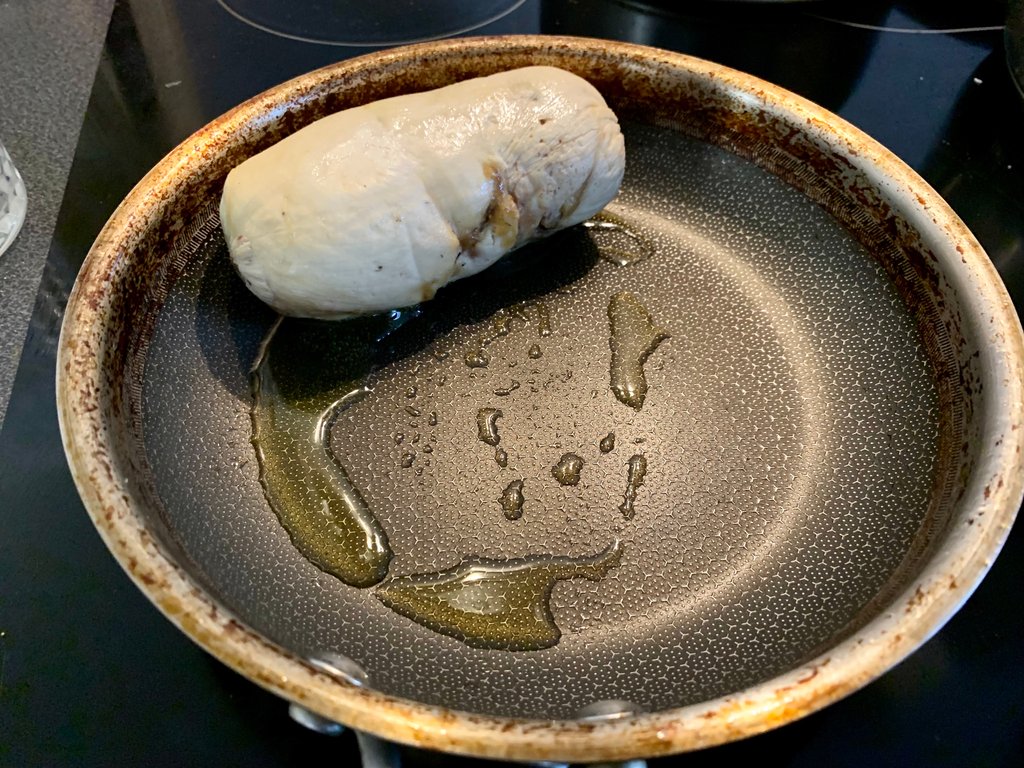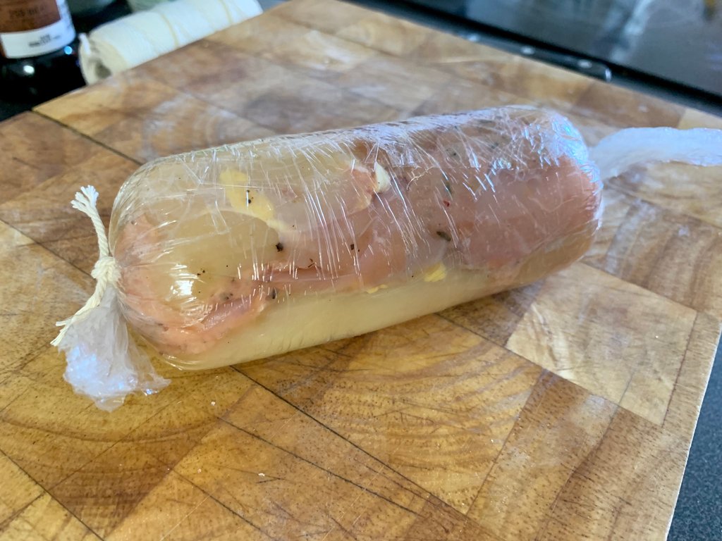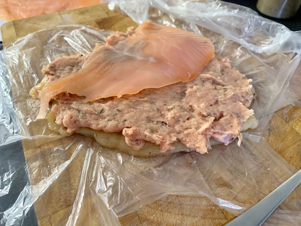 Filátka lehce poklepat, osolit jemně, potřít fáší a položit plátek uzeného lososa. Zarolovat a váleček zabalit do folie. Dát do vařící vody, odstavit z plamene a pošírovat cca 30 minut. Zachladit.