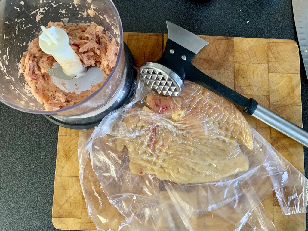 Na fáš vzít odřezky z vykosťování kuřete nebo kuřecí stehno, rozmixovat, osolit a případně přidat bylinky.