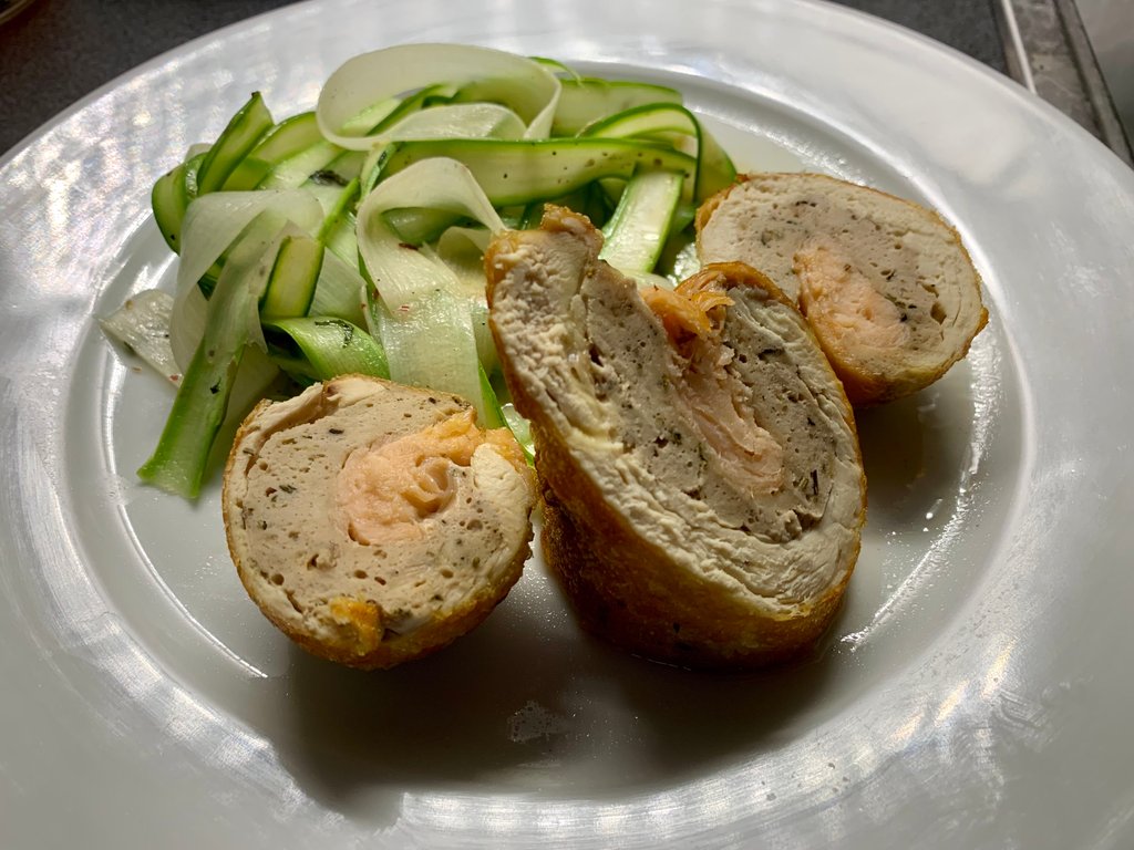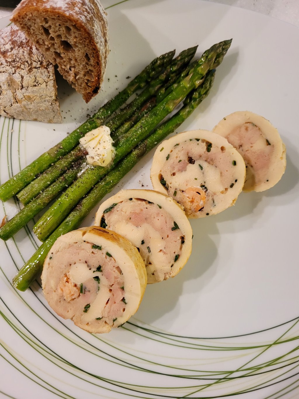 Roláda z kukuřičnéh kuřátka s uzeným lososem, chřest a malý salát