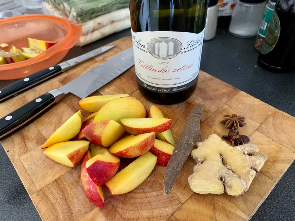 Nektarinky (mohou být i broskve) povařit krátce ve víně s cukrem, kořením a zázvorem. Nechat marinovat půl hodiny. Po vychlazení servírovat. Vhodné i k masu nebo šunce.